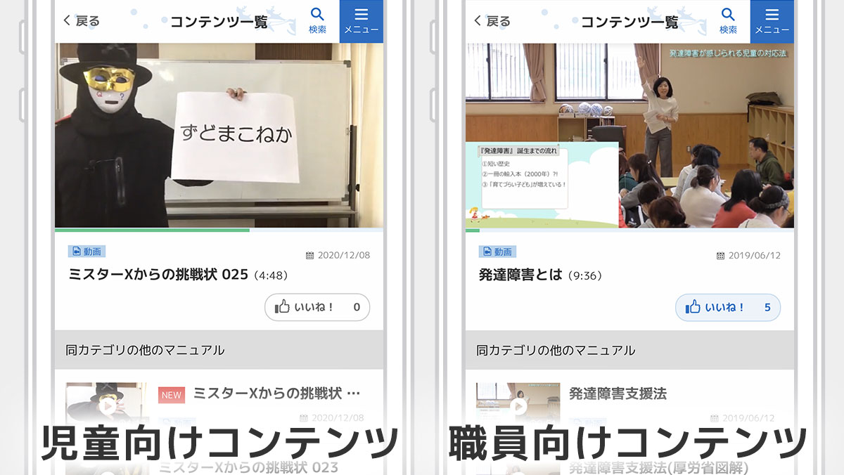 動画コンテンツは、支援員向けと児童向けに分けています。支援員向けは主に研修動画をアップロードしており、発達障害児童への対応やアレルギー対応、いじめ防止や感性保育などのテーマで分類しています。他の学童施設の事例共有も行っており、ユニークな遊び方や季節ごとの壁面飾りなどを撮影して投稿してもらっています。