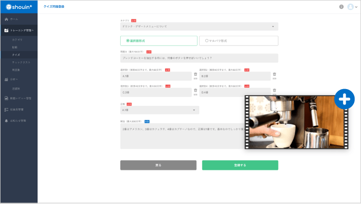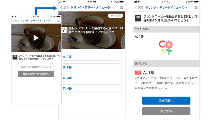 4択やマルバツ問題など回答形式を選択することができ、動画やチェックリストとあわせて使うことで、より確実な知識を身につけることができます。