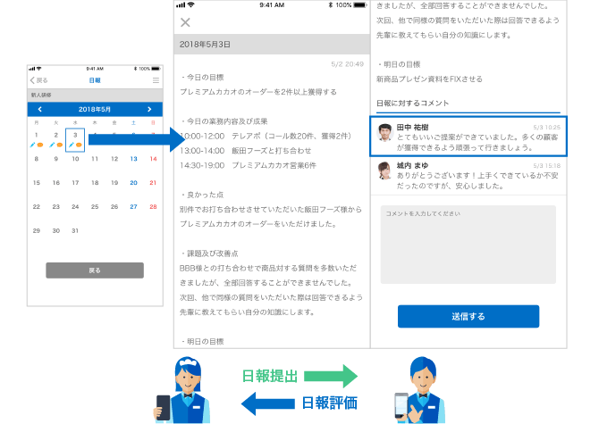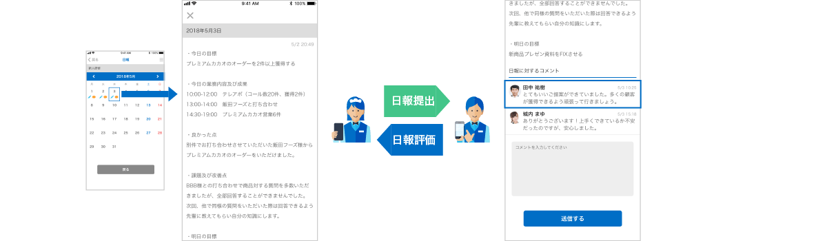 カレンダーで管理された日報では、過去の振り返りも簡単。